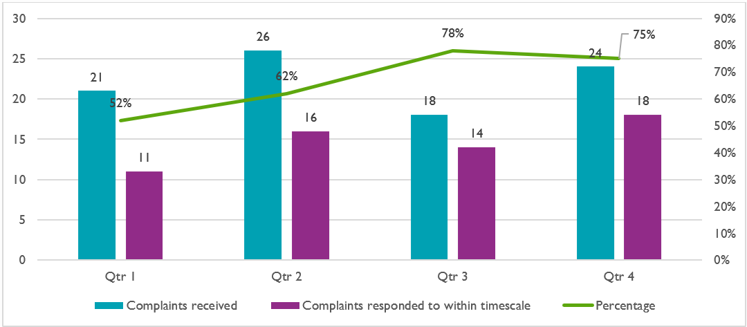 In 2023/24, 66% of complaints were responded to within the required timescales, an improvement from 60% in 2022/23. This represents a steady increase in performance compared to the previous year but remains below the 74% achieved in 2020/21.