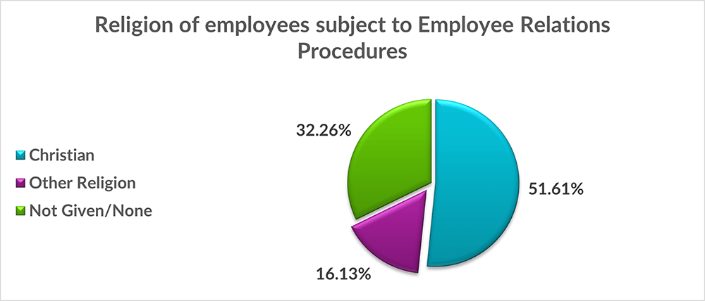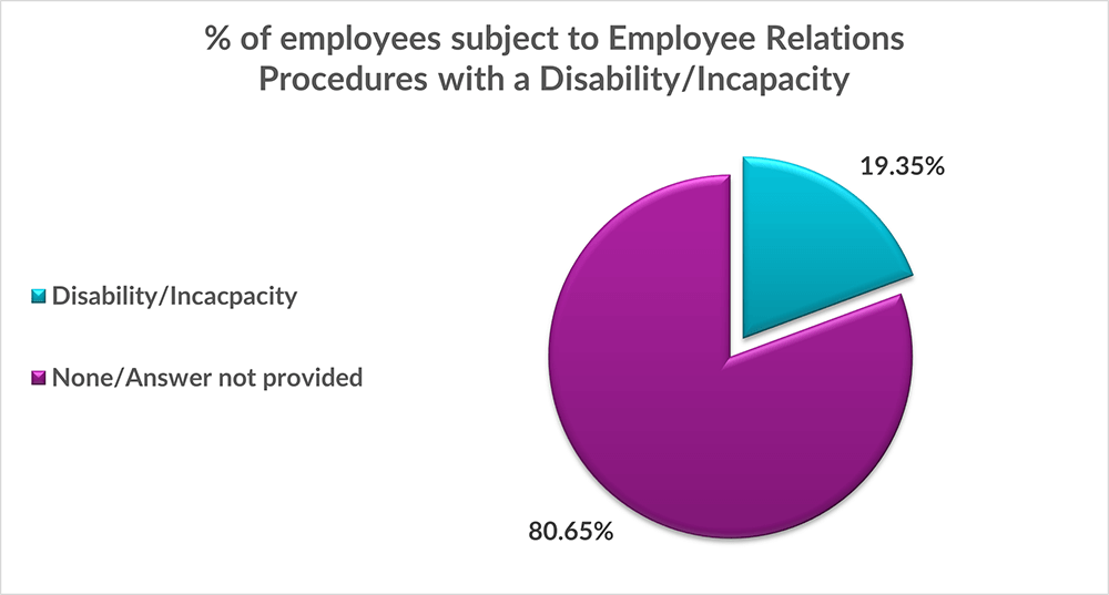 Chart showing that 19.35% of staff who had a Employee Relation Procedure had a Disability/Incapacity.