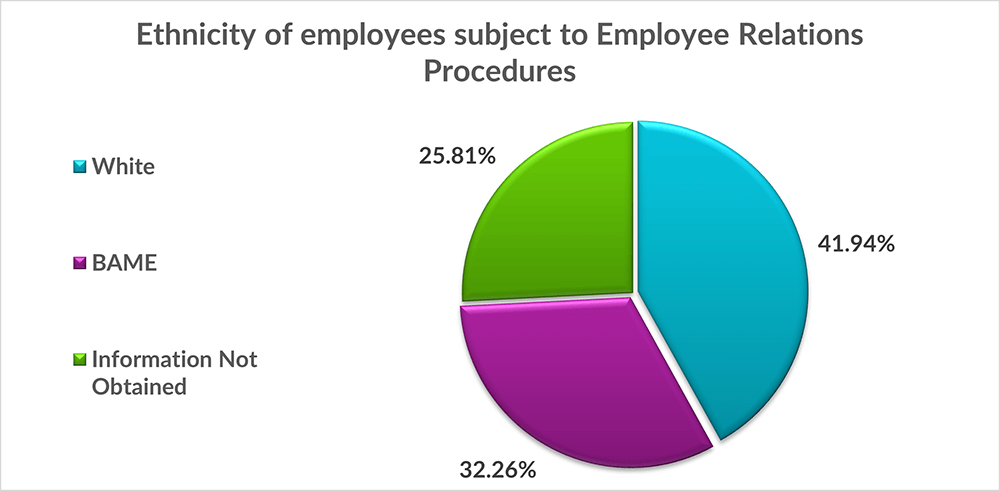 Chart showing that 41.94% of the Employee Relation Procedures were for people with a White ethnicity compared to 32.26% who were BAME.