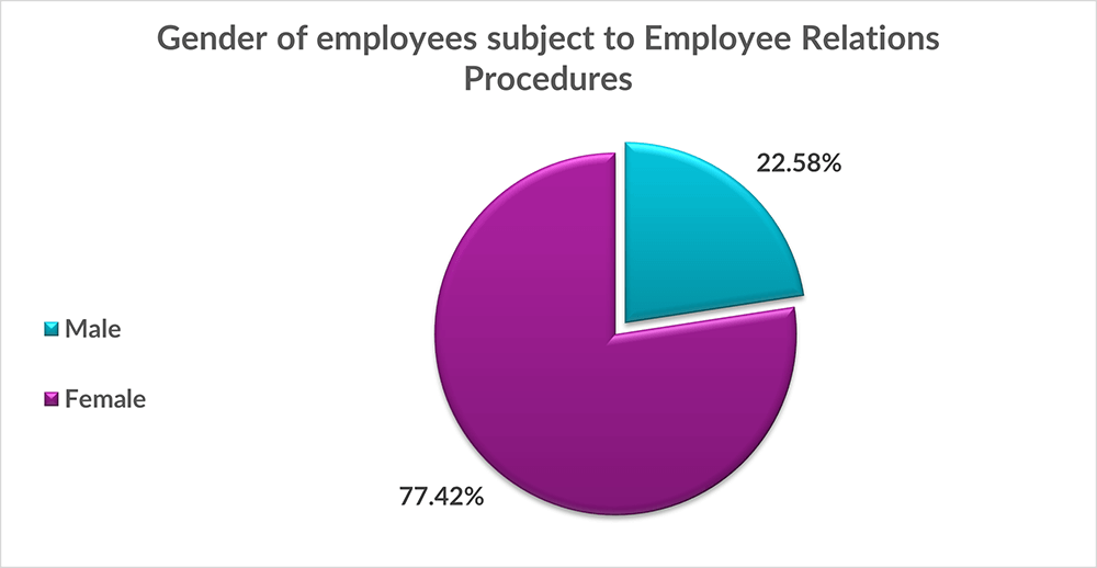Chart showing that 77.42% of Employee Relation Procedures were for Females compared to 22.58% Male's.