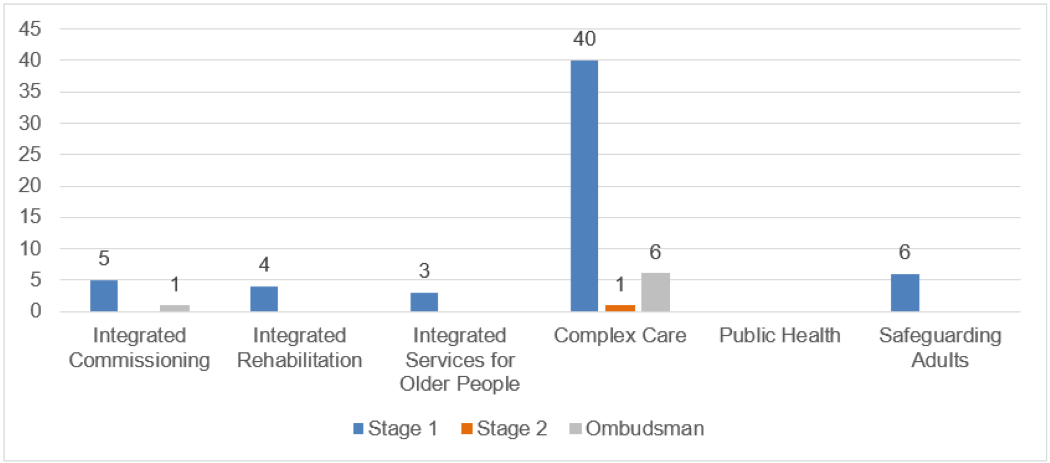 During this period, there was a significant variation in the number of complaints received across different service areas. As in the previous year, Complex Care received most of the Stage 1 and Ombudsman cases. The number of complaints in this area for the period was notably higher than in the past three years. In contrast, Integrated Commissioning, Integrated Rehabilitation, Integrated Services for Older People, and Safeguarding Adults had only a few complaints.