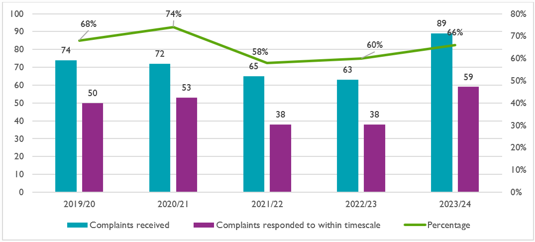 In 2023/24, 66% of complaints were responded to within the required timescales, an improvement from 60% in 2022/23. This represents a steady increase in performance compared to the previous year but remains below the 74% achieved in 2020/21.