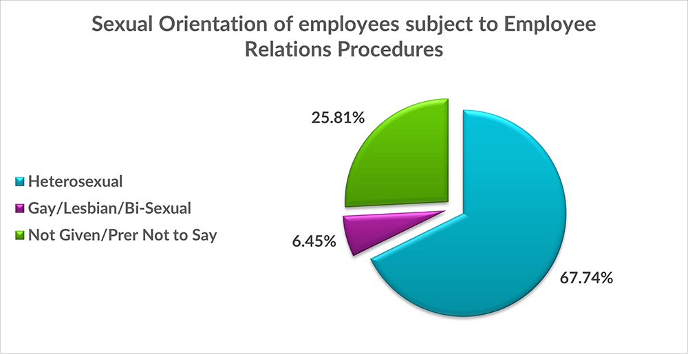 Chart showing that 67.74% of staff who had an Employee Relations Procedure were Heterosexual, followed by 25.81% who did not state their orientation and 6.45% of the staff were non-heterosexual.