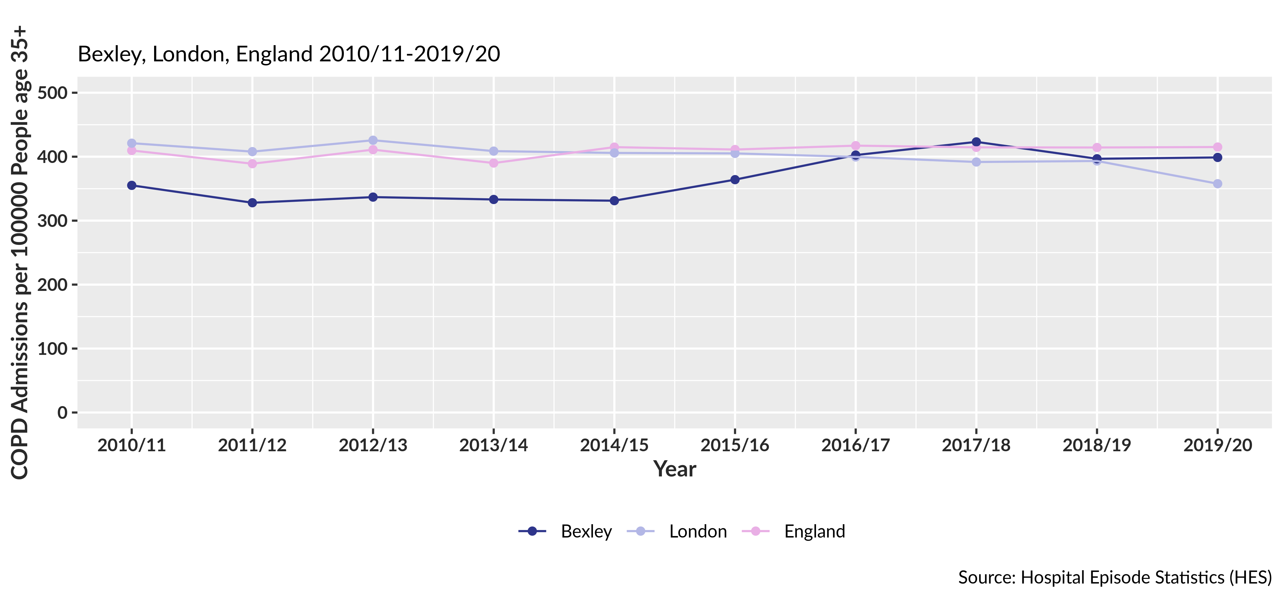 Figure 4 – Number of emergency hospital admissions for COPD per 100,000 people aged over 35 in Bexley.