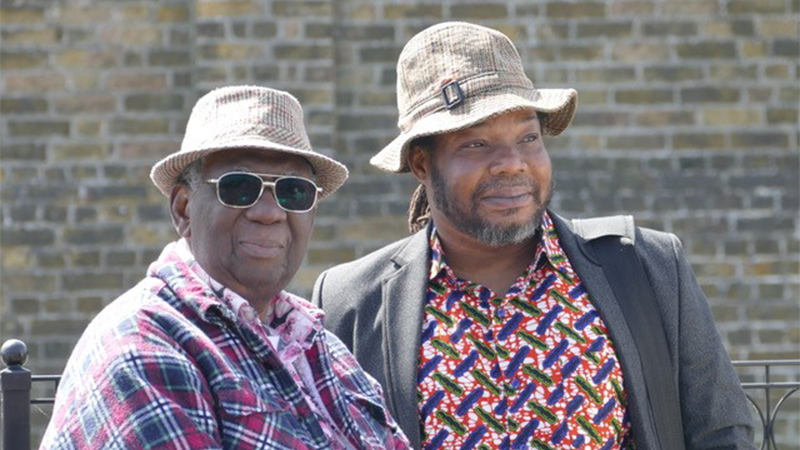 Two men stand together outdoors in casual attire, both wearing patterned hats