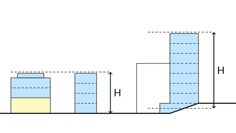 Fig.18 The building height (H) is the vertical distance between finished grade and the highest point on the building, including any plant located on the roof. On sloped sites the building height is measured from the average finished grade to the highest point on the building.