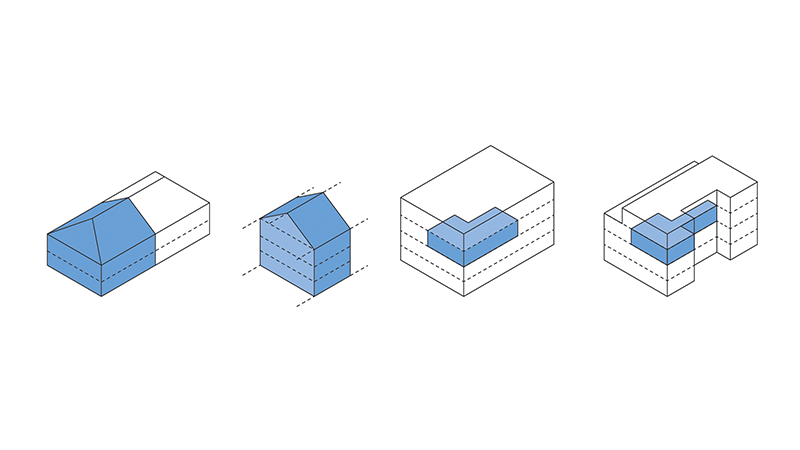 Fig.16 A higher form factor of a building increases the energy needed to heat and cool the interior. For example, semi-detached forms have a higher factor than an apartment within a larger block.