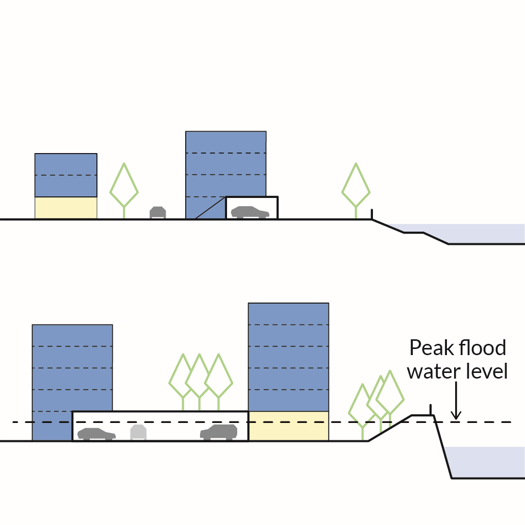 Fig.90 Ground floors in flood zones can be used for parking, commercial uses and non-principal living spaces. These should be designed to ensure there are no continuous blank frontages, for example by providing split-level maisonettes.