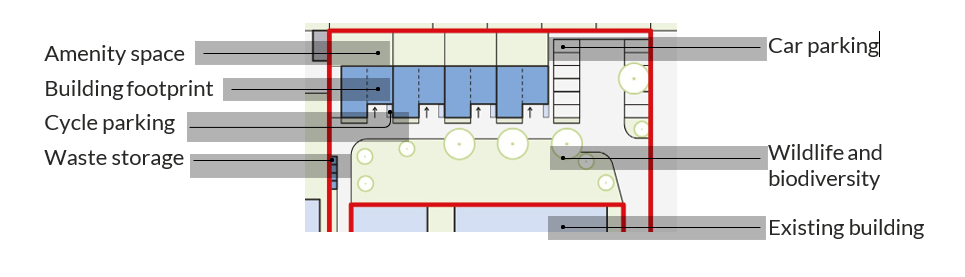 | Building footprint | Plot ratio – ratio between site area and building floor area expressed as a number e.g. 0.25 | Block plan. Refer to Context and Townscape sections on determining the building form and type. |
