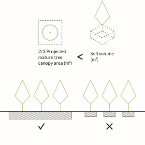 | Establishment | Applicants should use available planting systems that ensure an acceptable soil volume and avoid over-compaction. Tree pits can be protected from pedestrian and other traffic through the design of tree grilles or upstands in the paving. The required soil volumes and the approach taken may be tree species dependent – refer to advice from suppliers. |