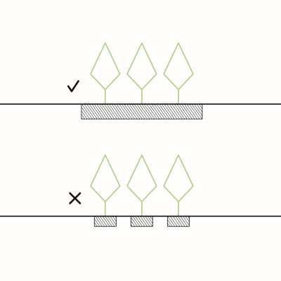 Following guidance in British Standard BS5837, care should be taken to place new trees a certain distance away from built structures to avoid future pressure of removal. Depending upon the diameter of the mature tree, this may require new trees to be placed between 0.5m-3m away from buildings and paving. Where possible, cellular tree pits measuring at least 1.5m x 1.5m should be used in hard landscaped areas. Tree pits need not be square and connected tree pits are encouraged, which make rectangular tree pits the typical recommended shape in hard landscaping. |