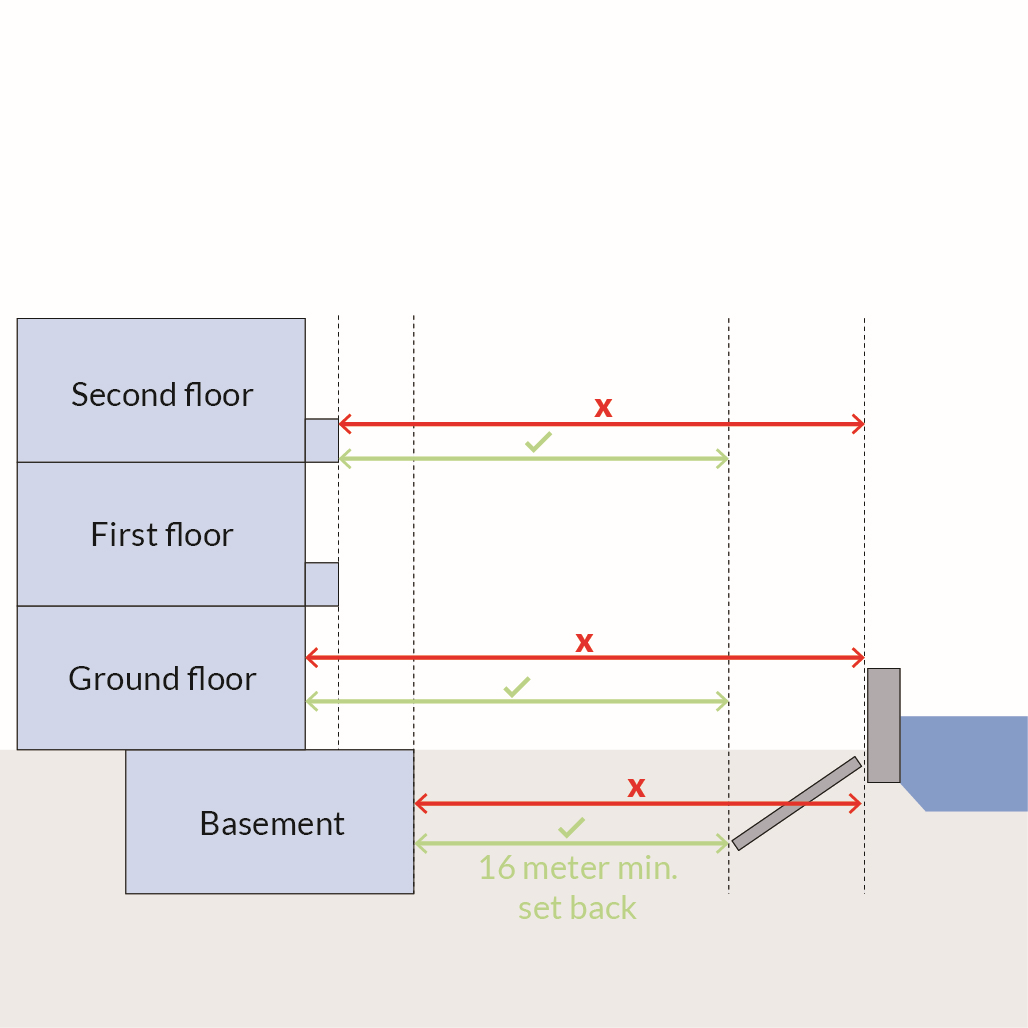 Fig.89 In line with Environment Agency guidance, all new development including basements and any overhanging features such as basements, must be setback a minimum of 16 metres from Thames Tidal Flood Defences, including any buried elements. The red arrows indicate the incorrect measurement of the recommended setback distances, whilst green shows the permitted min. 16 metre setback achieved.