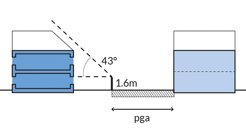 Fig.45 Developments should not obstruct a 43 degree line, taken from a point 1.6m above the ground level at the property boundary.