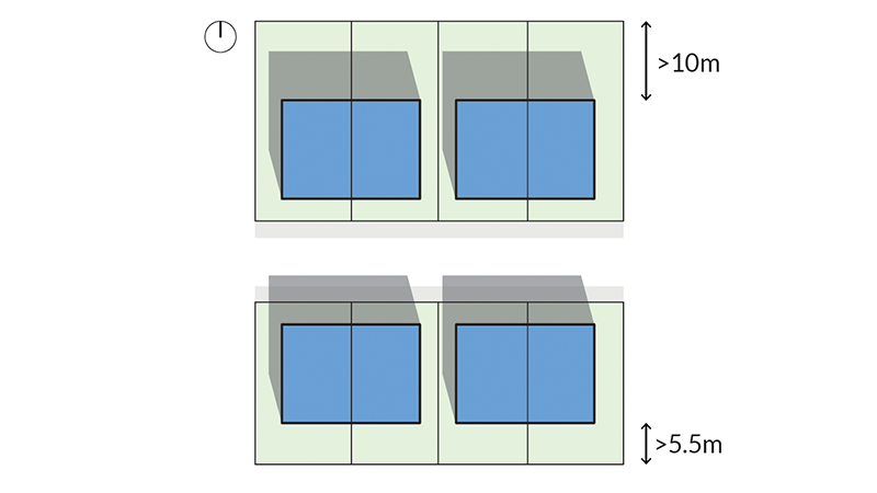 Fig.46 If new private gardens are placed to the north of buildings they should be sufficiently deep to ensure part of the garden receives sunlight throughout the year. South-facing gardens may be shallower, but still be large enough to accommodate typical garden furniture.