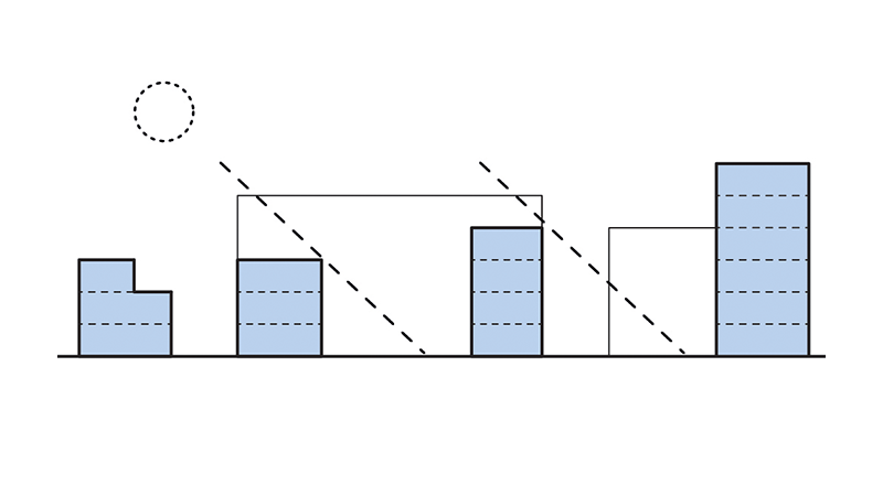 Fig.47 Buildings should be arranged to allow light and air flow into communal amenity spaces such as courtyards. This should be considered early on in the design process to ensure the site layout does not create uncomfortable or unusable spaces.