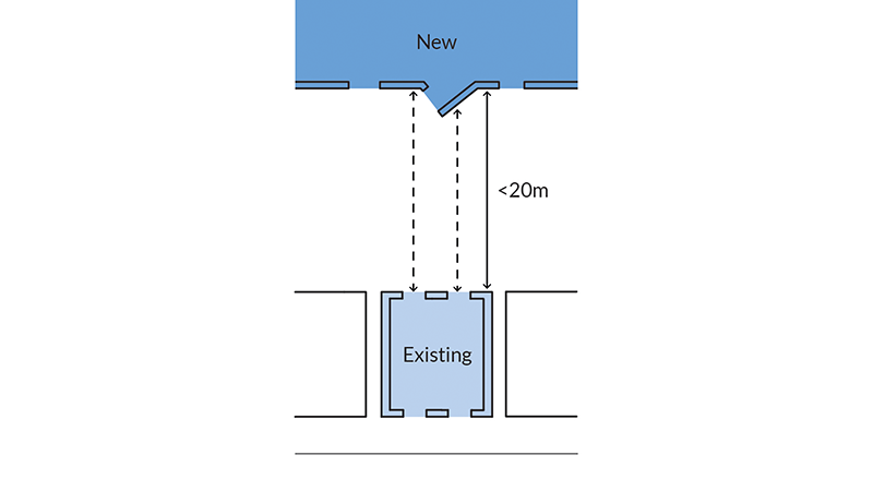 2.9 When developing a site that contains an existing building, the existing building’s windows can be classified as ‘new’ windows as shown in the code if the development site falls under a single ownership. When dealing with a building under multiple ownership, an existing building’s windows should generally be treated as ‘existing’.